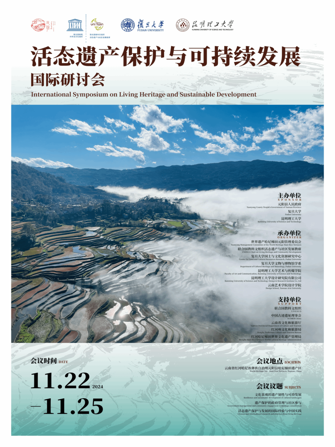 2024年11月22日至11月25日,由元阳县人民政府、复旦大学、昆明理工大学联合主办,世界遗产哈尼梯田元阳管理委员会、联合国教科文组织活态遗产与社区发展教席等承办的“活态遗产保护与可持续发展”国际研讨会于云南省红河哈尼族彝族自治州元阳县哈尼梯田遗产区举行。