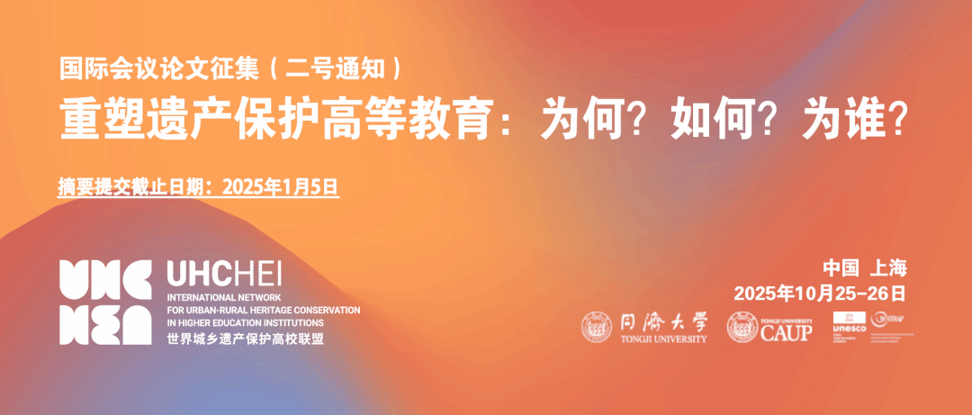 联合国教科组织亚太地区世界遗产培训与研究中心上海分中心(WHITRAP Shanghai)谨此宣布,世界城乡遗产保护高校联盟(UHC-HEI)首次国际会议的论文摘要征集截止时间已延长至2025年1月5日,UTC 00:00。该会议主题为“重塑遗产保护高等教育:为何?如何?为谁?”,旨在探讨城乡遗产保护教育领域的国际新经验、新思想与新趋势。会议将于2025年10月25日至26日在中国上海举行,由同济大学主办,同济大学建筑与城市规划学院、联合国教科组织亚太地区世界遗产培训与研究中心上海分中心(WHITRAP Shanghai)、《Built Heritage》和《建筑遗产》(Heritage Architecture)学术期刊等共同承办。获取更多信息及会议日程安排,请参阅以下摘要征集通知和提交模板。