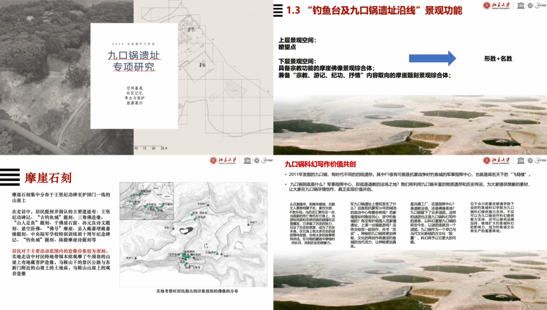 调研期间,四组成员除了完成本组专题研究,还对钓鱼城遗址九口锅区域进行了整合研究。从自然背景与沿线景观、历史记忆与社区功能、遗产要素与建筑复原、创意性科幻写作活动等角度,四组代表就九口锅区域的保护、展示与利用进行了展示和探讨。