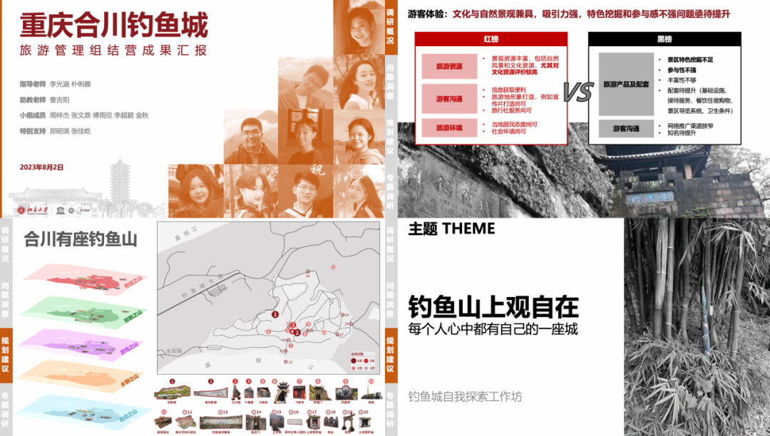 旅游管理组的汇报分为两个部分。第一部分主要从文旅资源、展示体系、旅游线路、游客研究和运营管理五个方面对钓鱼城景区的现状进行了梳理,分析得出目前存在的各类问题,并且有针对性地给出了提升建议。在第二部分,他们分别以奇迹、形胜、灵性、乡野和自在为主题,制作了钓鱼城遗址的阐释矩阵和文化地图,并进一步提供了相关文化活动的构想和策划思路。