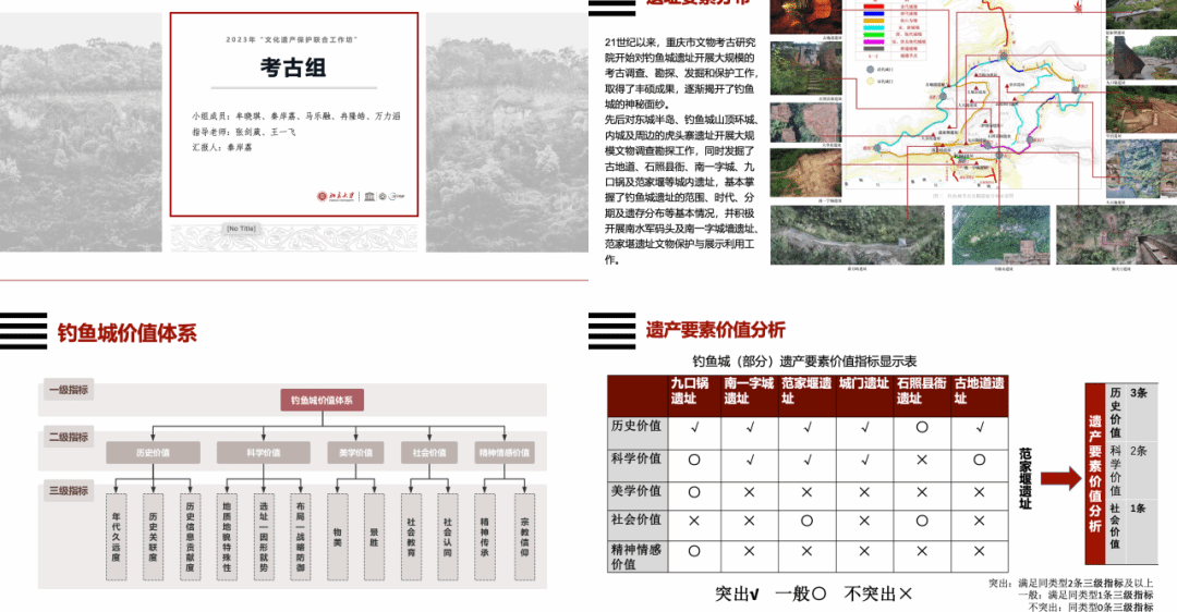 考古组基于钓鱼城考古资料和实地踏查,对遗产要素的分布进行了细致的整理。在此基础上,结合与遗产价值相关的国际宪章与学术成果,他们建构出了一套包括历史价值、科学价值、美学价值、社会价值和精神情感价值及其下属三级指标在内的钓鱼城价值体系,并以此为标准对各个遗产要素的保护现状给出了科学的评估及合理的建议。