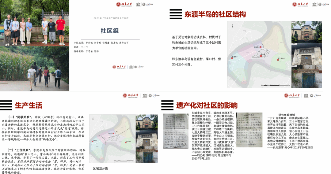 社区组以将社区记忆纳入钓鱼城遗产展示体系为目标,将对钓鱼城周边三个村落的调查访谈结果进行了集中展示。他们首先从人文地理、交通体系、生计生产等方面对东渡半岛的社区结构和历程进行了介绍,然后就遗产要素与社区之间的功能性和记忆性联系展开具体的分析。立足遗产化对于社区产生的各方面影响,他们对社区福祉与可持续发展给出了建议和思路。