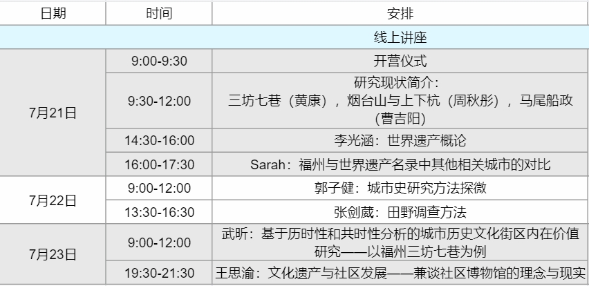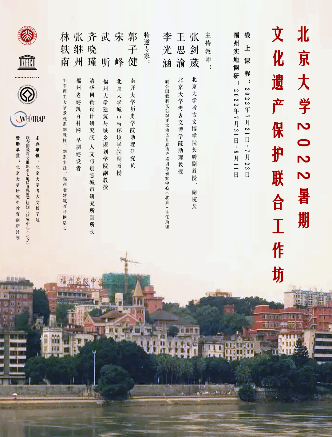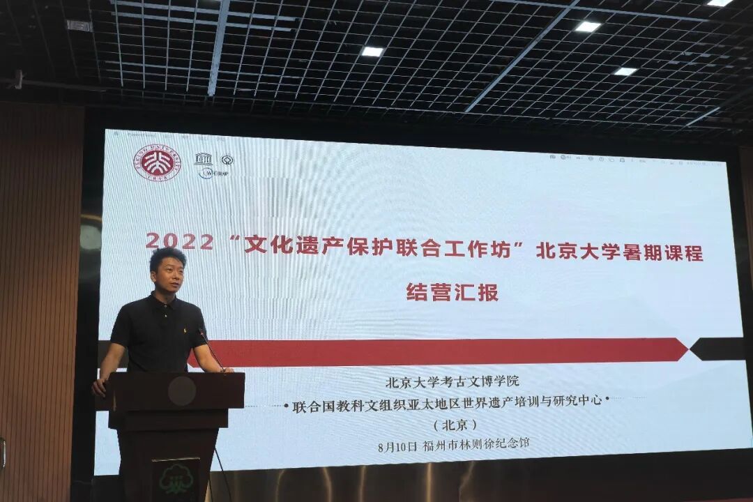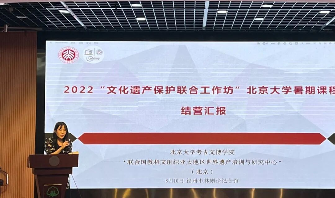 2022年8月10日,由北京大学考古文博学院、联合国教科文组织亚太地区世界遗产培训与研究北京中心(以下简称WHITRAP-Beijing)举办的2022文化遗产保护联合工作坊北京大学暑期课程在福州圆满结营。为期十天的现场调研中,学员们在福州的盛夏中辛勤奔走,分组对三坊七巷、烟台山、上下杭、福建船政和鼓岭建筑群进行了细致深入的现场调研,在工作坊各位老师的指导下撰写了万余字图文并茂的调研报告。各位学员在40度的高温与艳阳下挥洒着汗水,走遍了调研区域,用密集的踏查、访谈、讨论和思考,记录下文化遗产的过去与现在,书写下对福州历史叙事与遗产价值的真知灼见,在历史文化名城福州收获了丰富的知识,留下了难以忘怀的学习记忆。