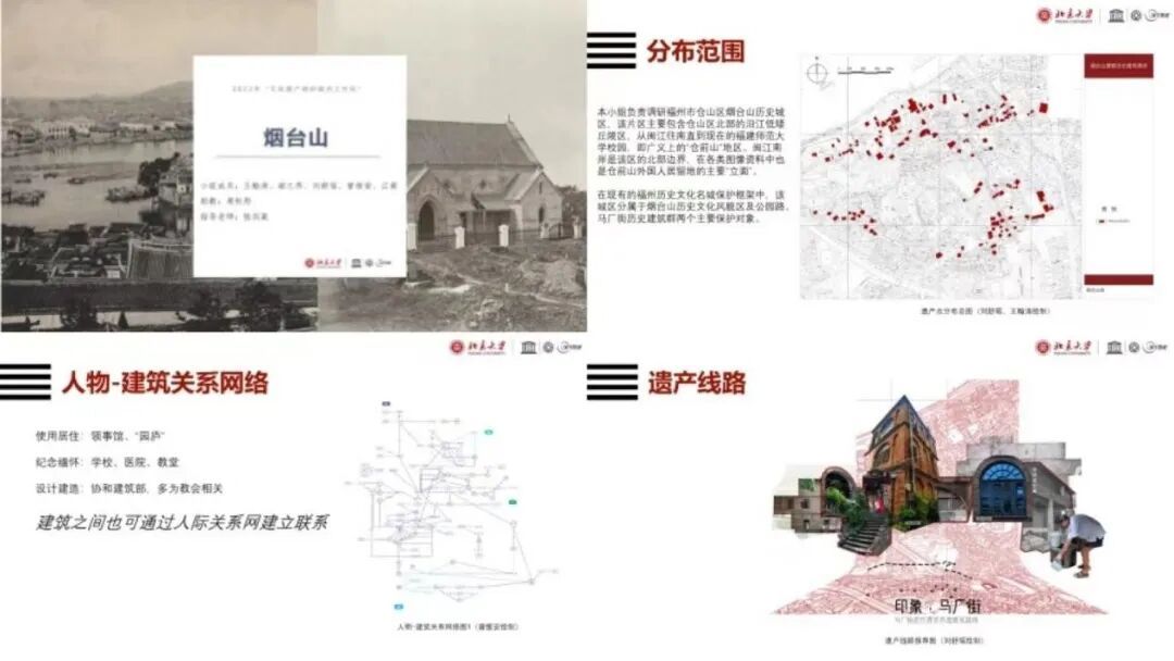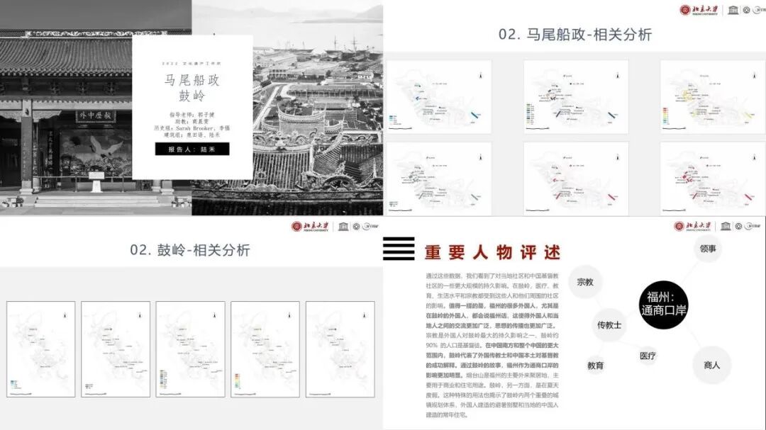 马尾-鼓岭组从工作总结、历史沿革、现状特征、重要人物和保管利用五个方面介绍了本组的调研方法、过程及成果:前期通过文献阅读对历史沿革、代表建筑等建立起基础了解;利用在福州的10天对福建船政建筑群、马限山建筑群、鼓岭建筑群等进行了实地调研,通过现场探察、人物访谈等方式,了解并筛选出相关推荐遗产点,并通过历史讲述和人物故事将其串联起来;最后,小组合作完成了调研报告,以清晰准确的分析图呈现了考察对象的现状和价值评估。