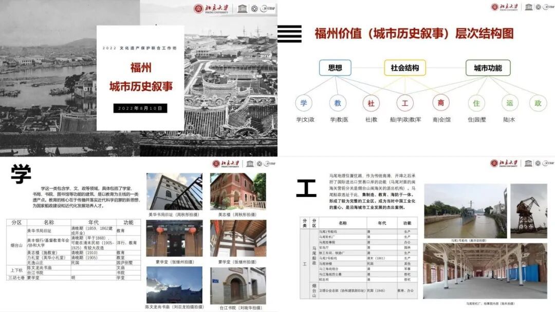 调研期间,工作坊的四组成员除了完成本组专题研究,还在教师组指导下,对福州城市历史叙事进行整合研究。四组代表对研究进展进行了汇报,从思想、社会结构、城市功能三个方面对各个建筑群的价值载体和叙事角度进行了分析。